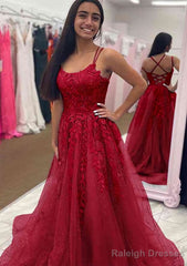 A-line Bateau Court Train Tulle Glitter Prom Dresses With Appliqued Beading