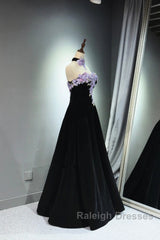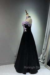 A-Line Black Velvet Long Party Dress With Lace Applique, Black Velvet Prom Dress