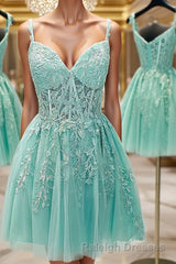 A-Line/Princess Sweetheart Corset Short/Mini Tulle Homecoming Dresses With Appliques Lace