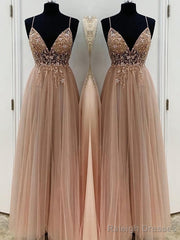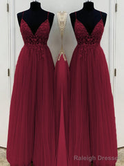 A-Line/Princess V-neck Floor-Length Tulle Prom Dresses With Beading