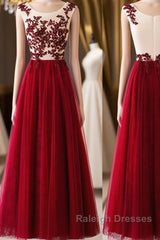 A Line Round Neck Burgundy Lace Tulle Long Prom Dress, Burgundy Lace Evening Dress, Burgundy Lace Graduation Dress