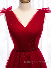 A Line V Neck Red Tea Length Prom Dress with Corset Back, Red Tea Length Formal Graduation Dresses