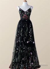 Black Floral Tulle A-Line V-Neckline Long Prom Dress, Black Evening Dress Party Dress