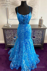 Blue Floral Lace Backless Trumpet Long Prom Gown