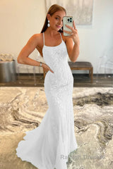 Blue Mermaid Tulle Backless Long Prom Dress with Lace