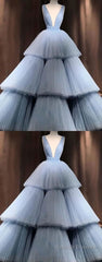 Blue V Neck Tulle Long Prom Dress, Blue Tulle Evening Dress