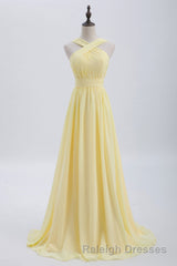 Cross Front Yellow Pleated Chiffon Long Bridesmaid Dress