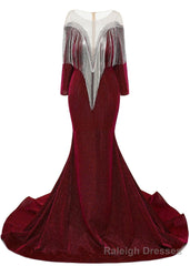 Deep V-neck Shiny BurgundyProm Dresses Long sleeves Mermaid Evening Party Dresses