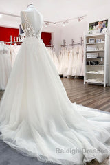 Elegant Long A-line V Neck Tulle Lace Open Back Wedding Dress