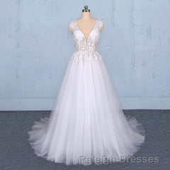 Flowy A-line Long V-neck Lace Tulle Beach Wedding Dresses Bridal Gowns