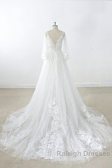 Long A-line V-neck Appliques Lace Tulle Backless Wedding Dress with Sleeves