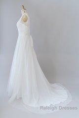 Long A-line V-neck Lace Tulle Backless Wedding Dress