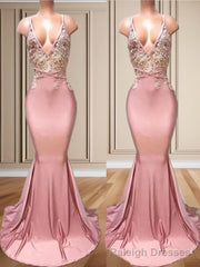 Mermaid V-neck Appliques Lace Sweep Train Charmeuse Dress