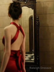 Modest Mermaid Backless Red Floor Length Evening Dress Satin Prom Dresses