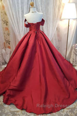 Off Shoulder Burgundy Satin Long Prom Dress, V Neck Burgundy Formal Evening Dress, Burgundy Ball Gown