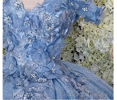 Off the shoulder blue ball gown , sparkly prom dress with flowers