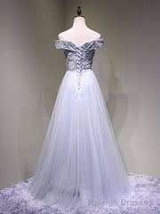 Off the Shoulder Burgundy Gray Lace Prom Dresses, Wine Red Grey Lace Formal Evening Dresses