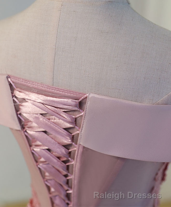 Pink A Line Off Shoulder Knee Length Prom Dress, Lace Homecoming Dresses