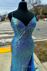 Purple Iridescent Sequin Empire Waist Lace-Up Mermaid Long Dress with Slit