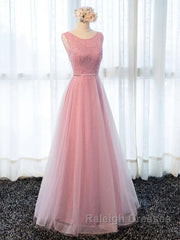 Round Neck Pink Beaded Long Prom Dresses, Pink Long Formal Evening Dresses