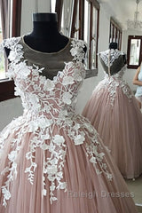 Round Neck Pink Lace Long Prom Gown, Long Pink Lace Prom Formal Evening Dress, Pink Ball Gown