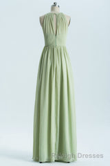 Sage Green Chiffon High Neck Long Bridesmaid Dress