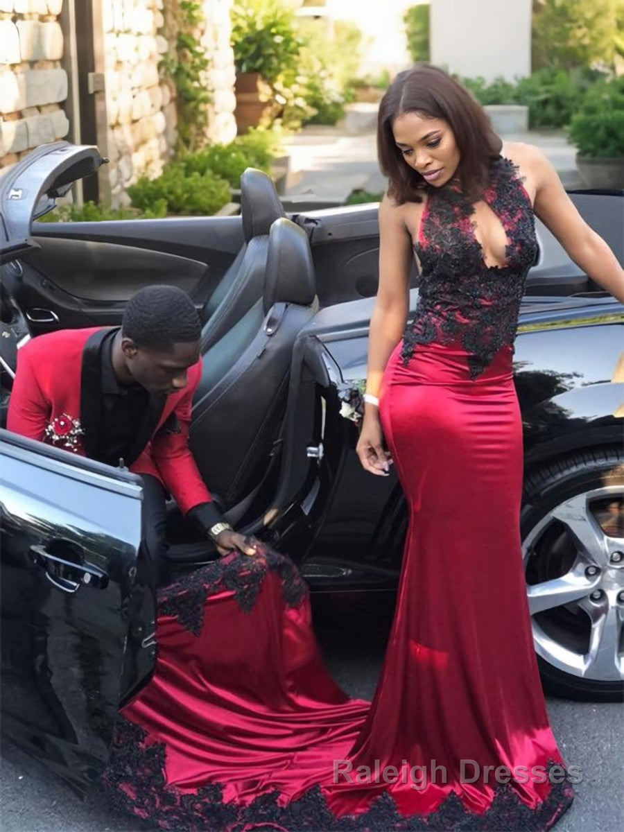 Sheath/Column Jewel Chapel Train Silk like Satin Prom Dresses With Appliques Lace