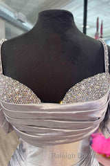 Silver Cold Sleeves Beaded Ruched Mermaid Prom Dress