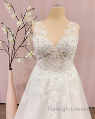 Simple Long V-neck A-Line Backless Wedding Dress With Appliques Lace