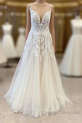 Stunning Long A-Line Spaghetti Straps Appliques Lace Tulle Wedding Dress