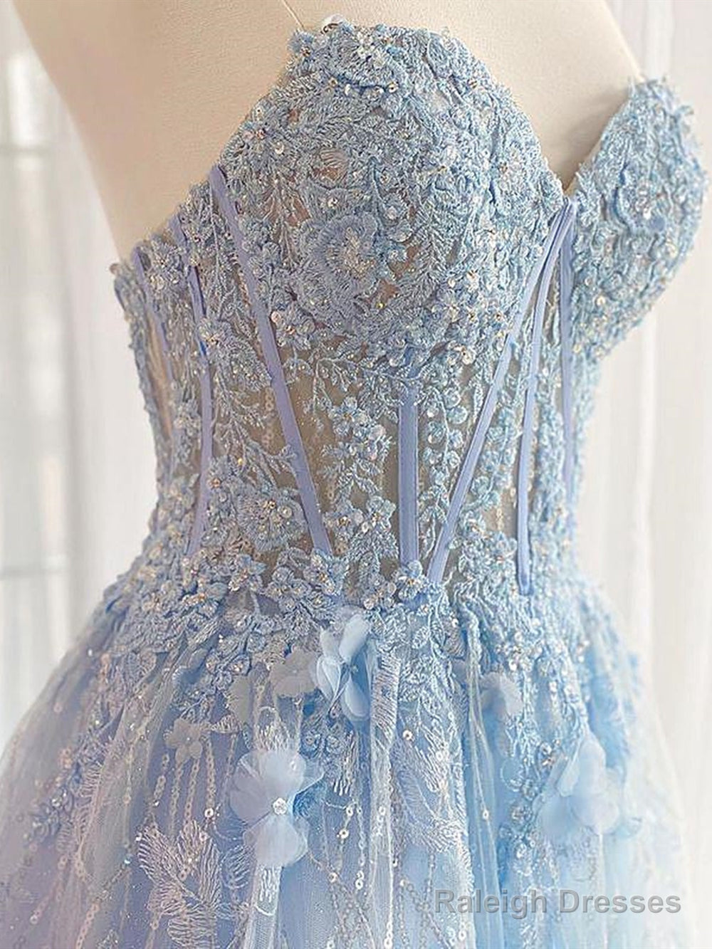 Sweetheart Neck Light Blue Lace Prom Dresses, Light Blue Lace Formal Evening Dresses