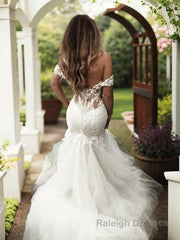 Trumpet/Mermaid Off-the-Shoulder Sweep Train Tulle Wedding Dresses With Appliques Lace