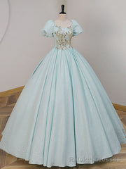 Unique A-LIne Satin Lace Long Prom Dresses, Blue Satin Sweet 16 Dresses