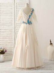 Unique Lace Applique Tulle Long Prom Dress Light Champagne Bridesmaid Dress
