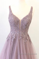 Unique v neck tulle lace long prom dress, tulle evening dress
