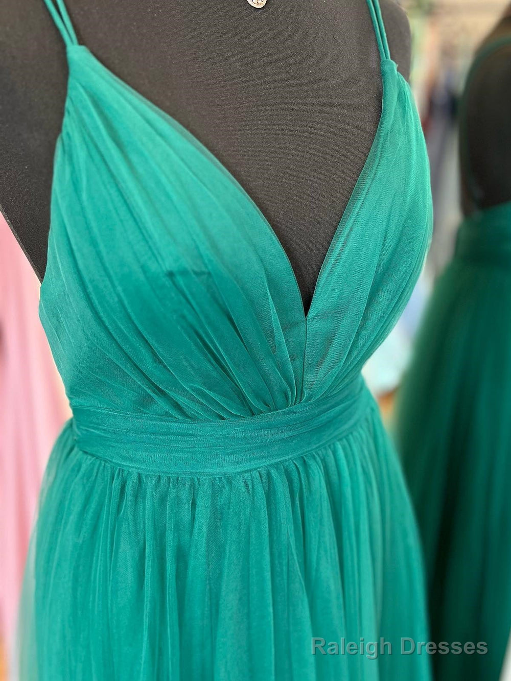 V Neck Dark Green Tulle Long Prom Dresses, V Neck Green Tulle Long Formal Evening Dresses