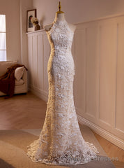 White Mermaid Lace High Neck Backless Wedding Dress
