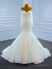 White Mermaid Tulle Long Sleeve Beading Sequins Wedding Dress