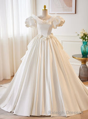 White Satin Puff Sleeve Backless Flower Wedding Dress