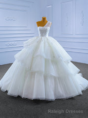 White Tulle One Shoulder Pleats Beading Wedding Dress