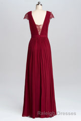 Wine Red A-line Chiffon Long Bridesmaid Dress with Cap Sleeves